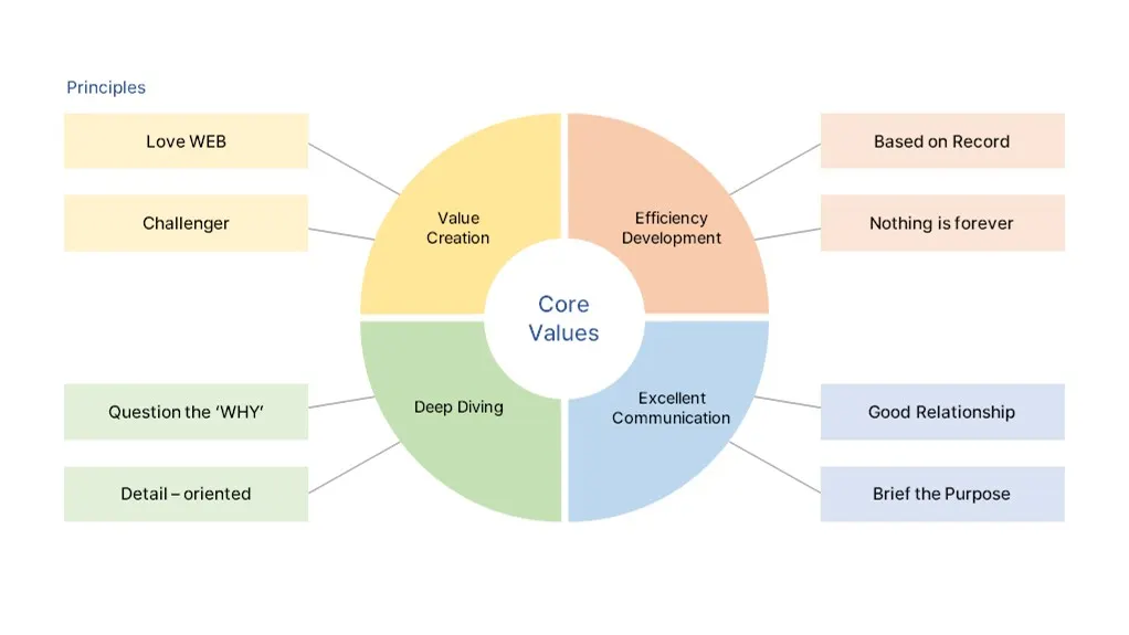 Principles(원칙)은 Core Value를 실천할 수 있는 일상에서의 생각과 행동 원칙을 의미합니다.